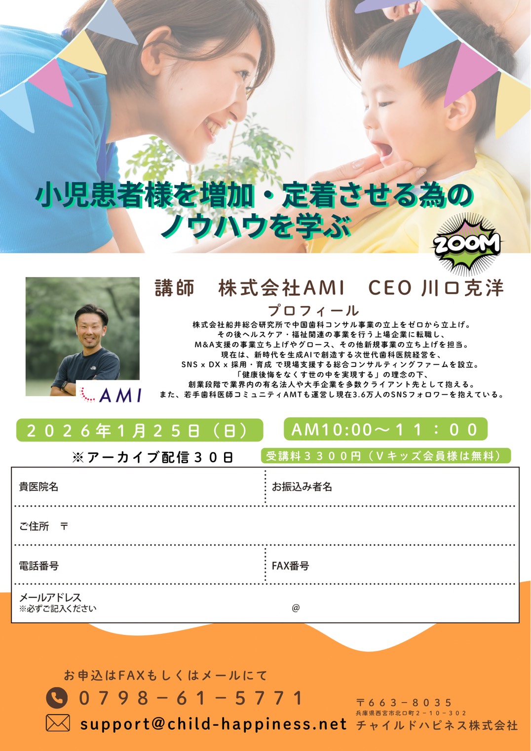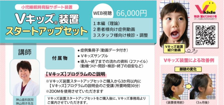 セミナーのご案内 セミナー情報 Vキッズプログラム完全マニュアル説明セット WEBでのお申込み FAXでのお申込み ※販売は提携歯科医院様限定とさせていただきます スペシャルアドバンスセミナー WEBでのお申込み FAXでのお申込み 【ZOOM】2026年1月25日 小児患者様を増加定着させる為のノウハウを学ぶZoom WEBでのお申込み FAXでのお申込み 【ZOOM】2026年2月17日(火)姿勢と舌を整えるベロヨガ® 講師の先生と一緒にトレーニング WEBでのお申込み FAXでのお申込み Vキッズ訪問セミナー(講師 神山明子先生) FAXでのお申込み こども睡眠力アドバイザー資格講座セミナー 2025年秋期コース WEBでのお申込み FAXでのお申込み 小児科専門医 成田奈緒子先生ご講演 WEBでのお申込み Vキッズ訪問セミナー(講師 小尾淳子) FAXでのお申込み その他開催中イベントはこちら セミナー資料ダウンロードページへ Vキッズを歯科医院に導入していただくためにはスタートアップセットのご購入をお願いしております。 Vキッズ装置スタートアップセット WEBでのお申込み お問い合わせはこちら メールでのお問い合わせ